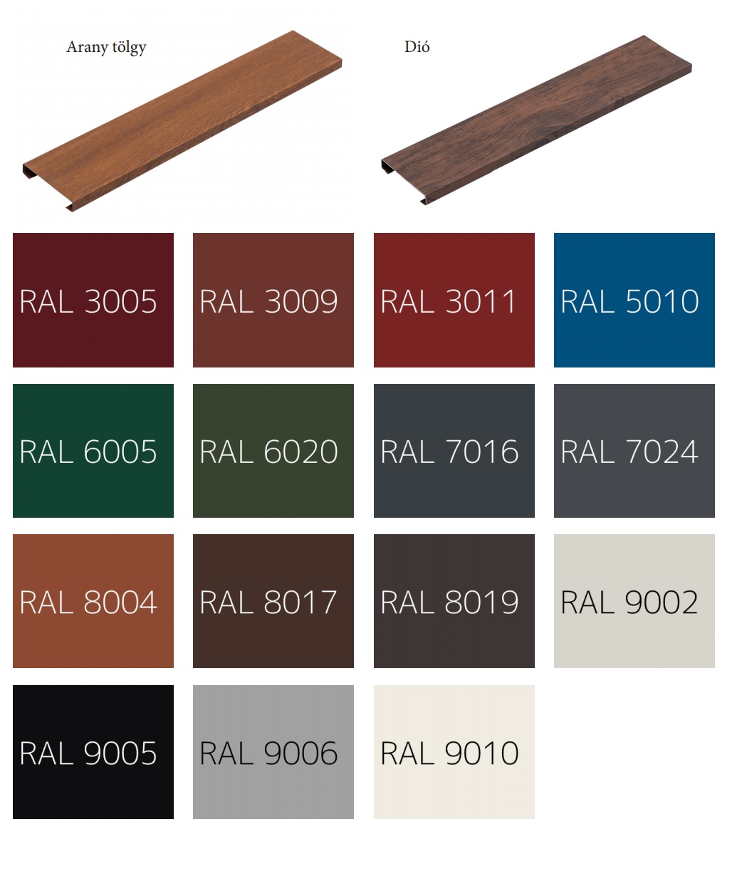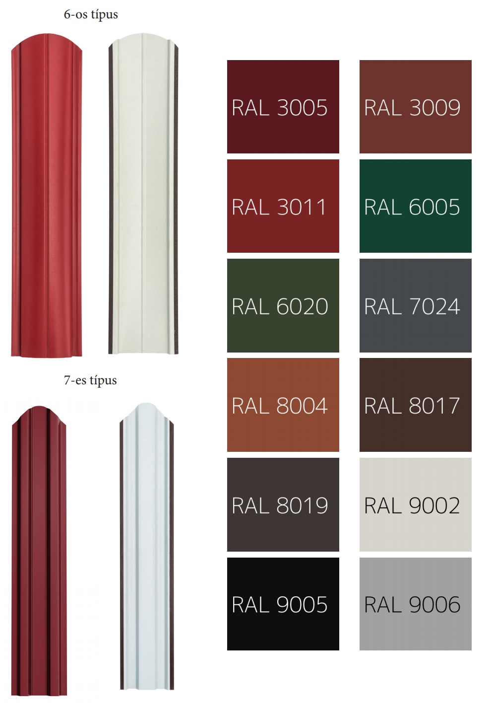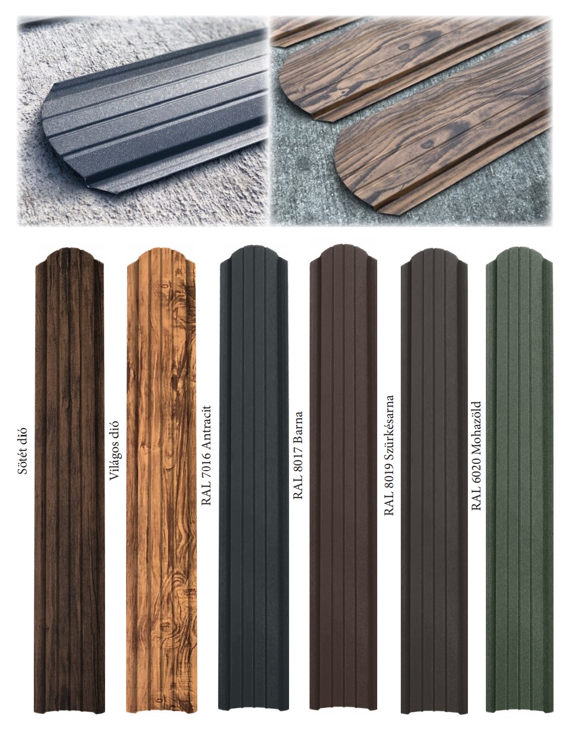Az elemek ívelt véggel, 1000mm, 1250mm, 1500mm, 1700mm hosszúságban készülnek, függőleges elrendezésre alkalmasak. Két oldalon színezett.